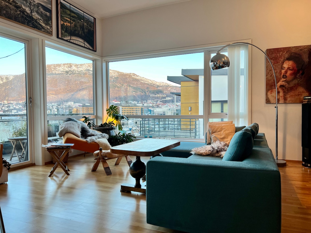 At city center Roof terrasse Seaside View of both Ulriken and Fløyen Modern Easy with public transport Quiet neighborhood Parking space can be rented for additional 500 kr pr night Several restaurants nearby Sauna 5 minutes walk Beach 5 minutes walk