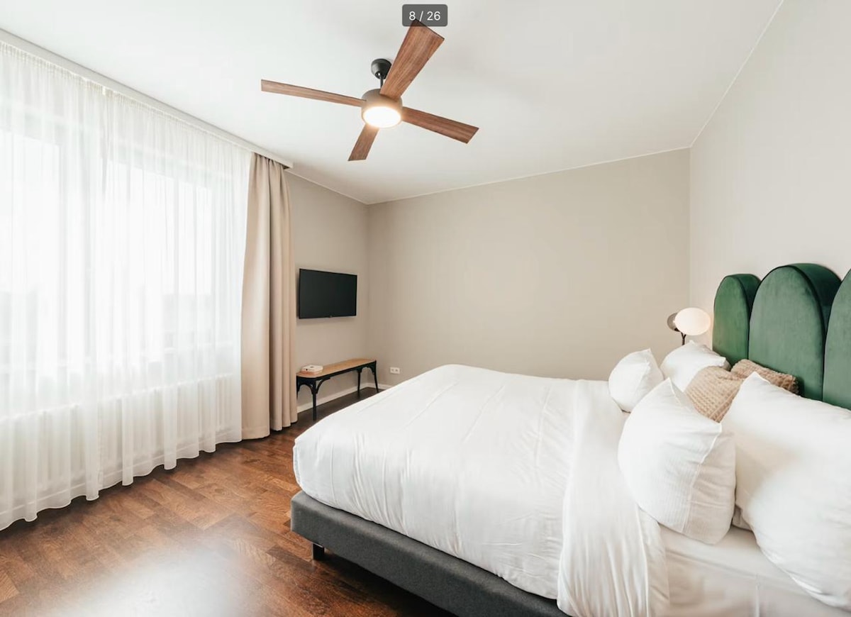 The Two Bedroom apartment has a total size of 59m² and includes 2 bathrooms (shower/bathtub with professional hair dryer and cosmetic), a living room with sofa bed and TV, a Double Bedroom with TV and a Single Bedroom. It also has large cabinet space, a fully equipped kitchen with dishwasher, washing machine and coffee machine, dining table. It can accommodate up to 3 adults and one child/infant (a child up to 9 years on a sofa bed and/or an infant in an extra cot).