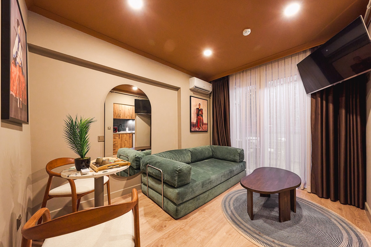 This charming hotel apartment offers a unique blend of simplicity and elegance with its modern, refined design. Perfect for two people or a couple, it includes a comfortable double bed, a well-equipped kitchenette, a private bathroom, and a 40-inch smart TV. Large windows . Ideally located just steps from Ortaköy Coast, Bosphorus Bridge, famous kumpir and waffle shops, and the historic heart of Ortaköy in central Istanbul.