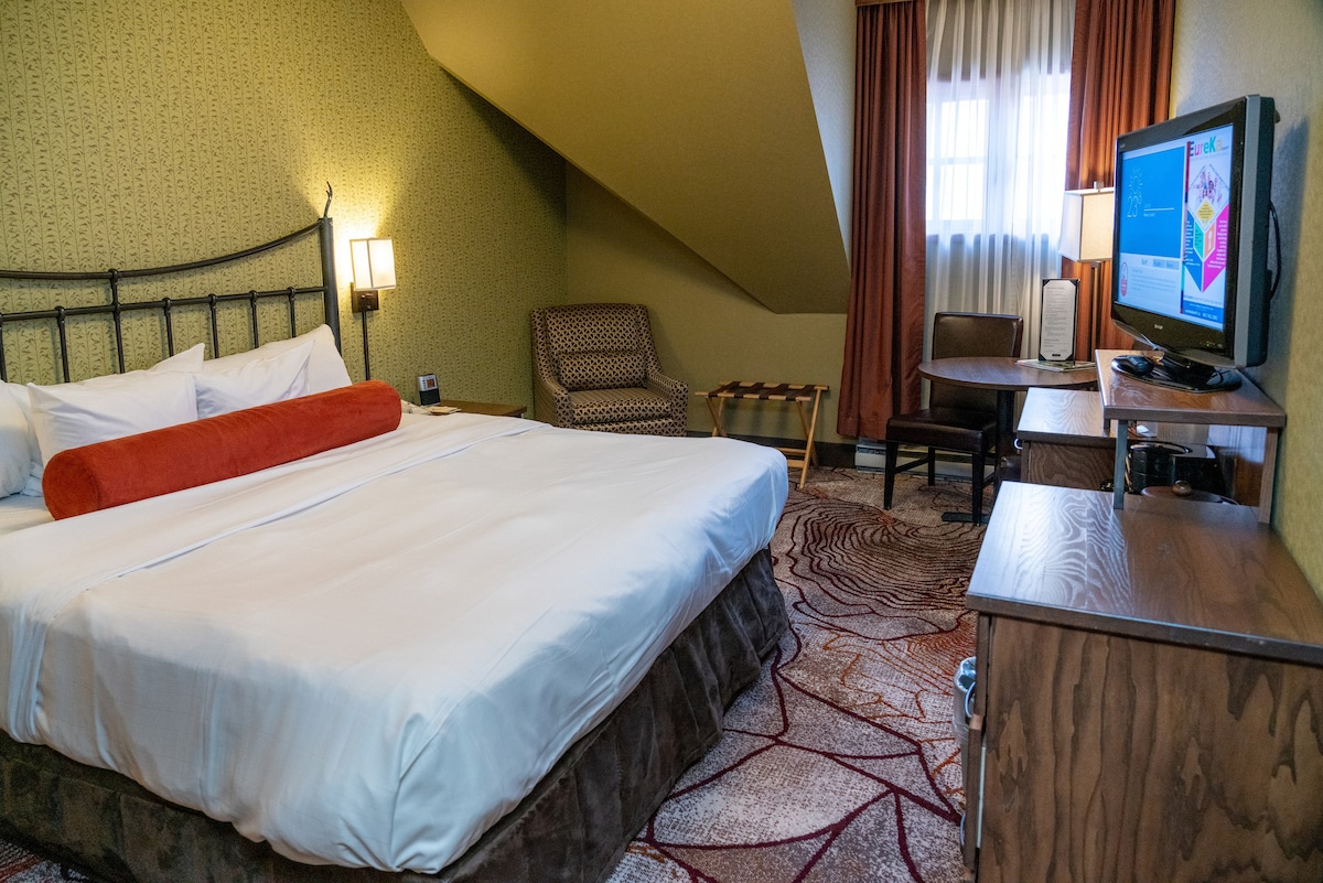 Our Deluxe King rooms offer a cozy space for up to two guests. These rooms feature a plush King bed with premium linens, a gas fireplace, and a comfortable living area. Each unit also includes one full bathroom, Wi-Fi, air conditioning, a coffee maker, a mini-fridge, and one free parking spot.