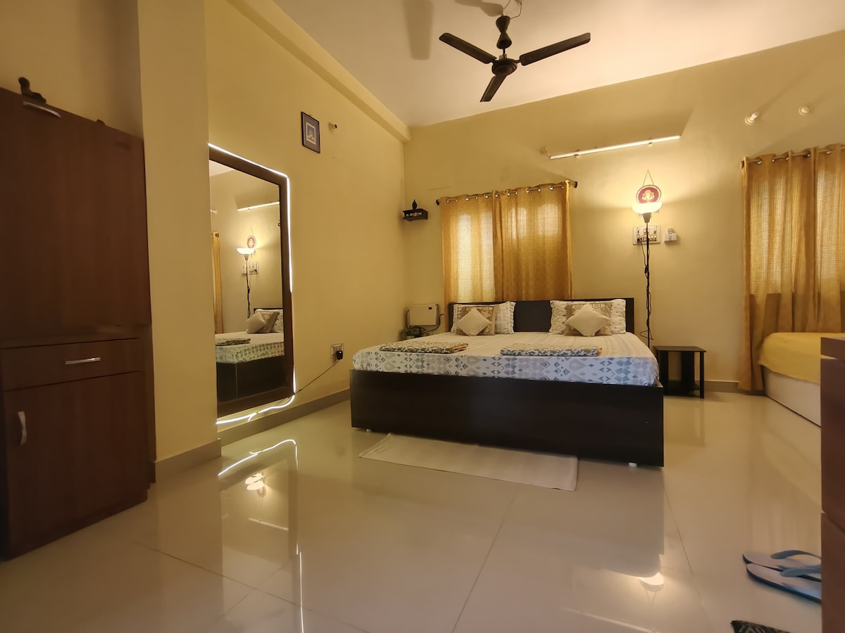 There are 2 big size bedroom with attach big size bathroom and a common room with bathroom.On the entrance there is bright & spacious common lounge, dinning, working area with patio & balcony , along with a large & equipped kitchen. you are travelling with a group of friends or family, you can rent the whole of the 2-bedroom and enjoy the space in total privacy. The apartment is perfect for 4 people but up to 6 people can be accommodated for an extra charge.