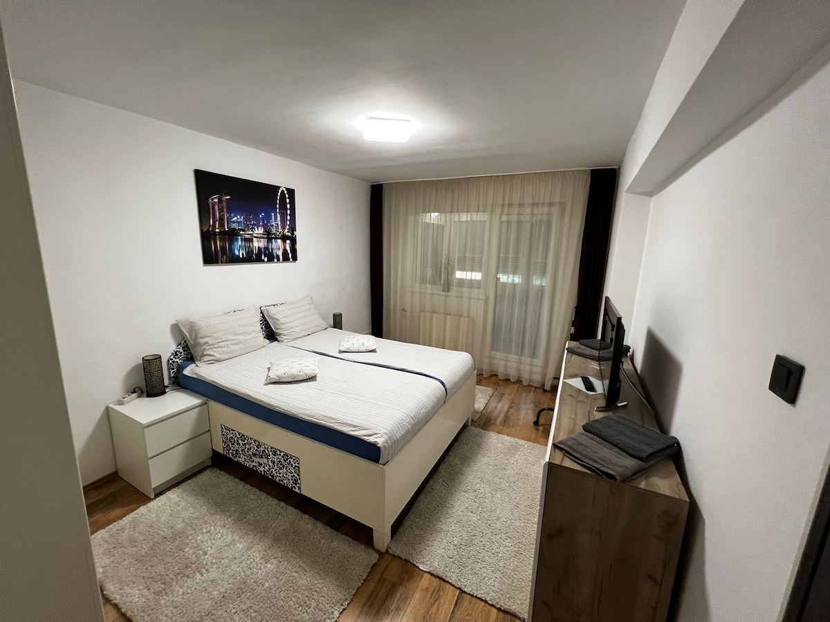 Apartament modern, etaj 1, aproape de centrul Oradea (0,7 km), lângă Ramada, Aeroport, Lotus Mall 2. Complet renovat, oferă WiFi gratuit, aer condiționat, Smart TV în fiecare cameră, balcon pentru fumători. Dispune de living spațios, bucătărie utilată, baie cu duș, WC de serviciu, 2 dormitoare (pat matrimonial & canapea extensibilă). Ideal pentru familii, prieteni sau afaceri. Capacitate max.: 5 pers. Aproape de magazine, transport & atracții. Fără petreceri/animale!