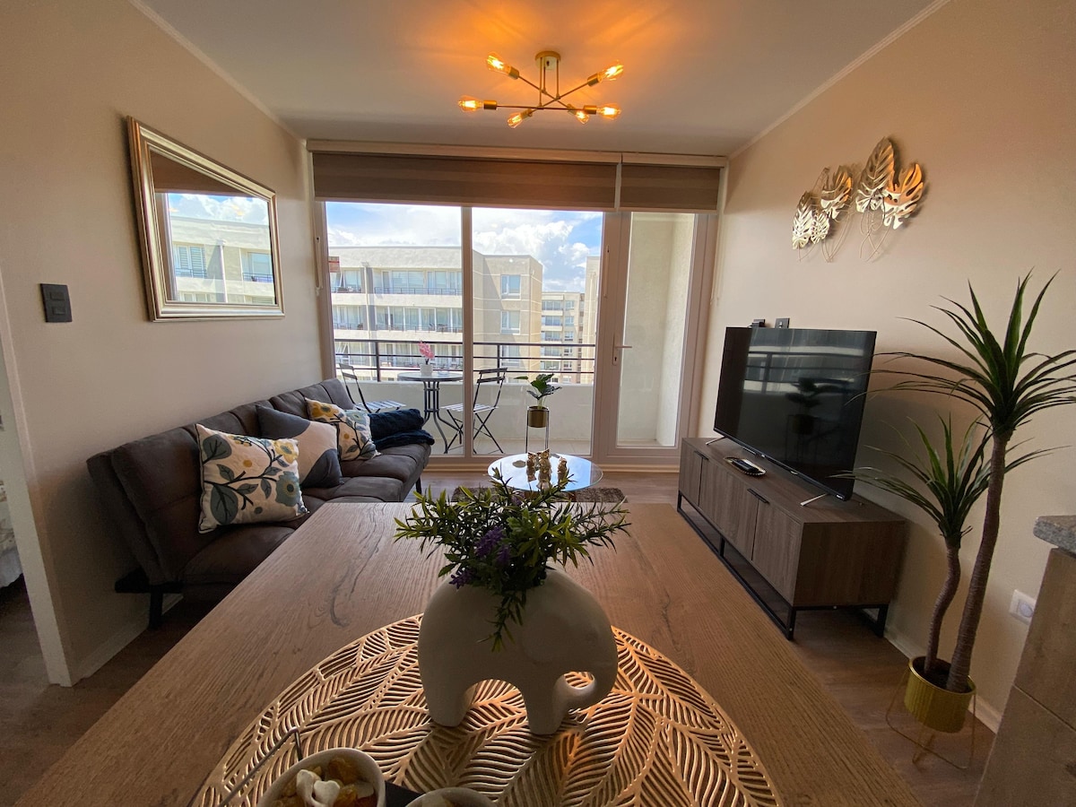 Departamento full equipado de un dormitorio, baño en suite. Cocina equipada, mesada de granito. Estacionamiento para 1 auto. Apto para 3 personas. Excelente ubicación, cerca de supermercados, banco, lavandería, pubs y restaurantes, centro comercial, y locomoción a la puerta. Hermosa vista a la Laguna Chica de San Pedro de la Paz. A 10 min del centro de Concepción, 12 min del aeropuerto, 15 min del Terminal de buses Collao. Portería 24 hrs.