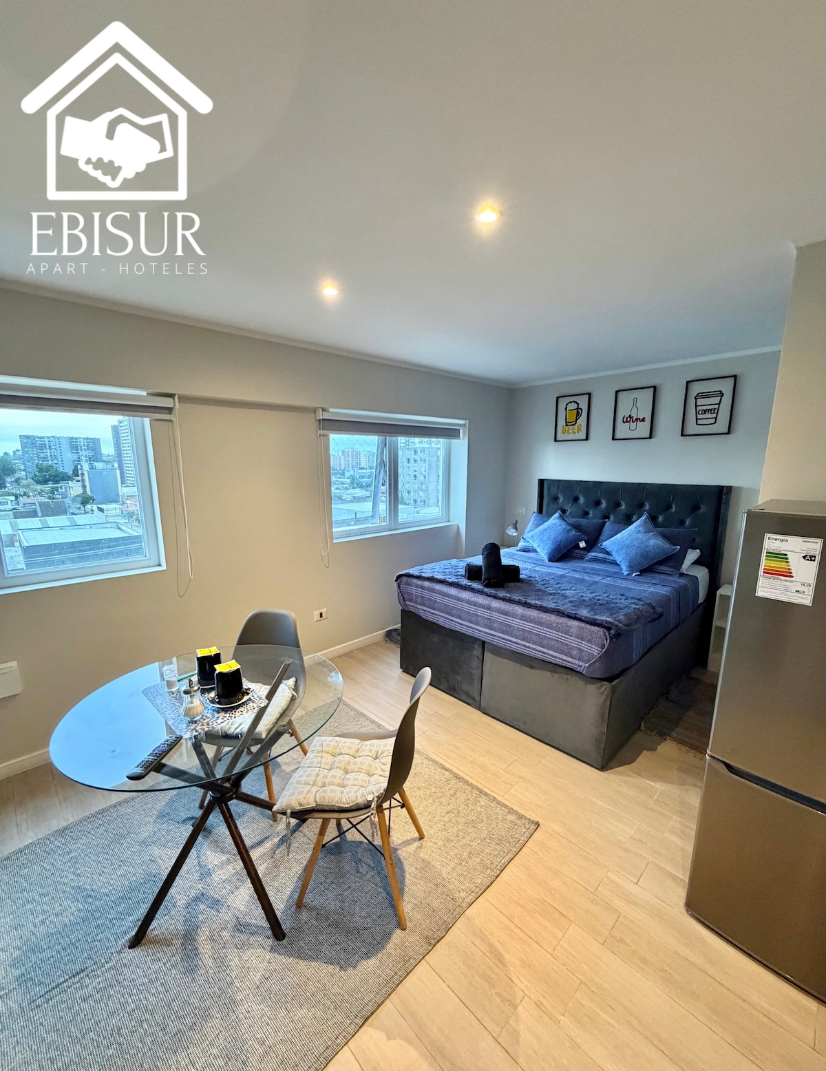 Departamento nuevo, céntrico, cómodo, limpio, seguro, moderno, amoblado, dos ambientes, equipado para 3 personas, consta de una habitación con una cama matrimonial de 2 plazas y un sofá cama. Además posee tv cable, wifi, terraza, calefacción, parrilla eléctrica, gimnasio, conserjería, 24hrs, estacionamiento, lavandería ( lavadoras y secadoras ) locomoción a la puerta, cercano a supermercados y universidades, centro de Concepción, ubicado frente a estadio Collao, a pasos del terminal Collao