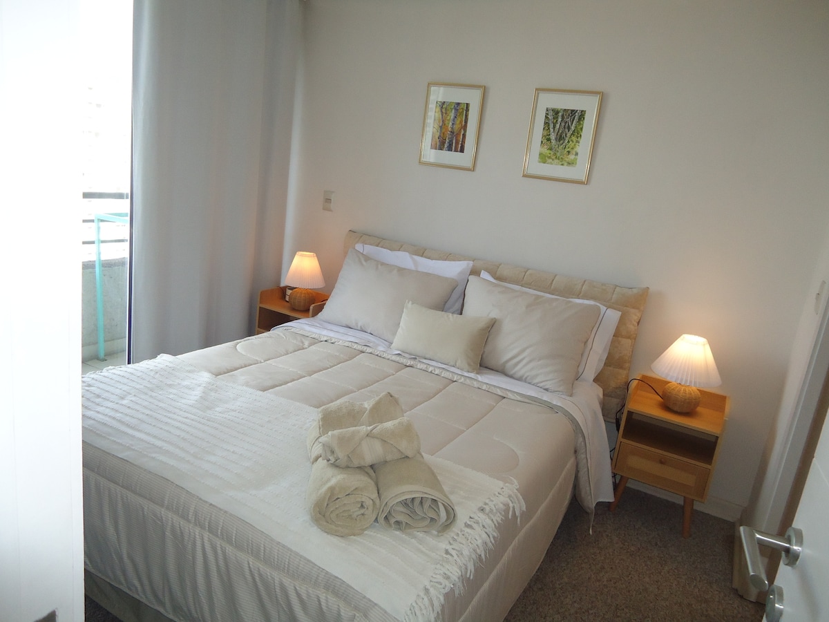 Departamento nuevo, céntrico, cómodo, limpio, seguro, moderno, amoblado, dos ambientes, equipado para 3 personas, consta de una habitación con una cama matrimonial de 2 plazas y un sofá cama. Además posee tv cable, wifi, terraza, calefacción, parrilla eléctrica, gimnasio, conserjería, 24hrs, estacionamiento, lavandería ( lavadoras y secadoras ) locomoción a la puerta, cercano a supermercados y universidades, centro de Concepción, ubicado frente a estadio Collao, a pasos del terminal Collao