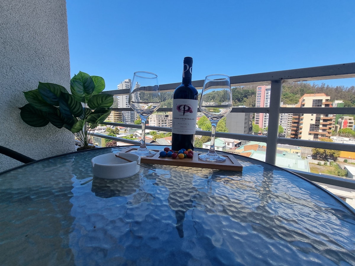 Departamento full equipado de un dormitorio, baño en suite. Cocina equipada, mesada de granito. Estacionamiento para 1 auto. Apto para 3 personas. Excelente ubicación, cerca de supermercados, banco, lavandería, pubs y restaurantes, centro comercial, y locomoción a la puerta. Hermosa vista a la Laguna Chica de San Pedro de la Paz. A 10 min del centro de Concepción, 12 min del aeropuerto, 15 min del Terminal de buses Collao. Portería 24 hrs.