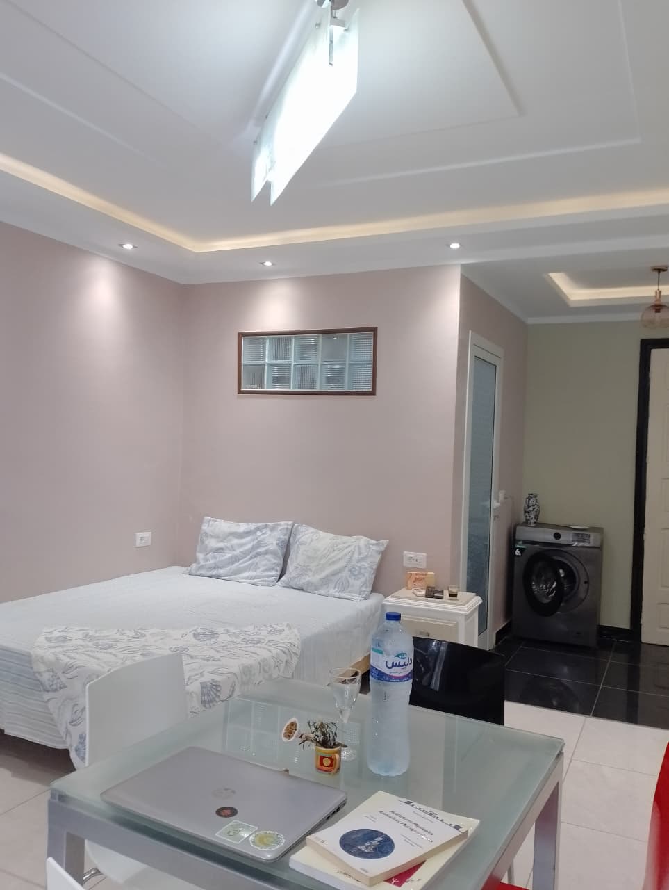 Profitez d'un logement élégant et central au cœur de la Médina de Tunis, fraîchement rénové: une chambre à coucher avec un lit deux places, et un sofa lit à deux places, une terrasse commune, un espace salon salle à manger avec un bain de soleil délicieux, une salle de bain art déco avec un ensemble de sanitaire unique, un authentique parterre en carreaux ciment, et une baignoire en fonte sur pieds, une cuisine pleine de charme. Le logement un accès à unrooftop commun et une buanderie commune