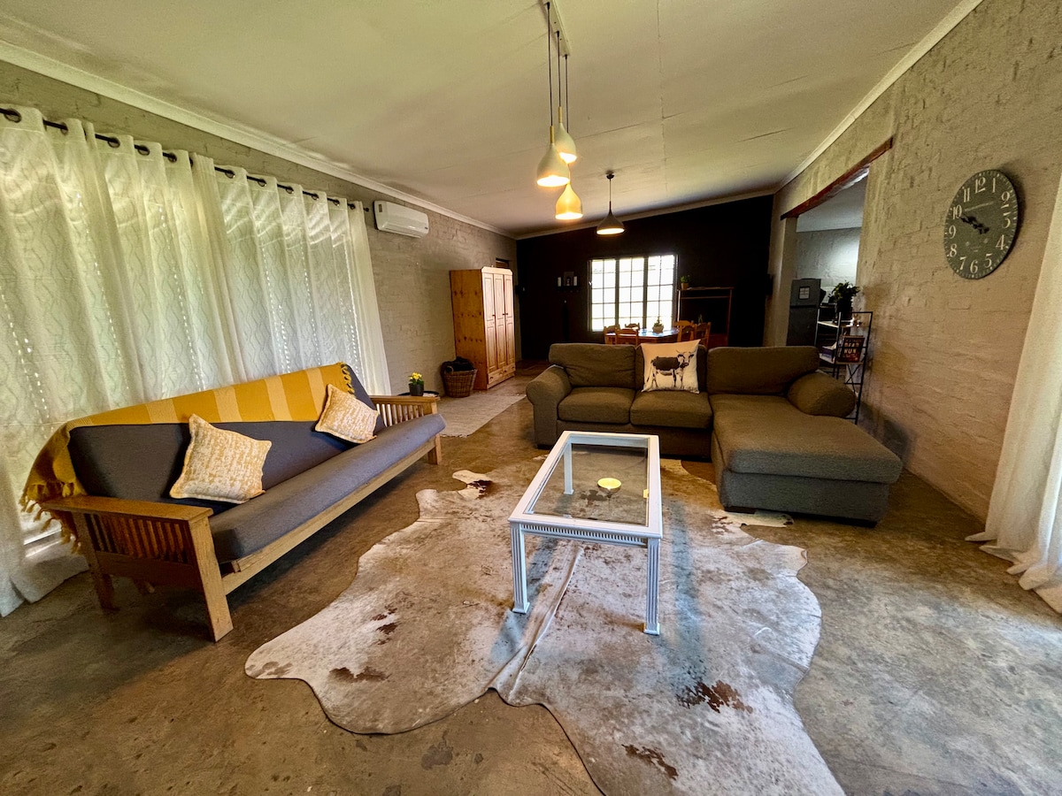 Enjoy a comfortable stay at our spacious self-catering guesthouse, ideal for relaxing. The outdoor area features a barbecue facility and firepit, perfect for evenings under the stars. The guesthouse has two bedrooms: one with a queen bed and en-suite bathroom, and one with two single beds and an adjacent bathroom. A sleeper couch is available in the living room. Guests can enjoy air-conditioning, Wi-Fi, TV, a fully equipped kitchen, and secure private parking.
