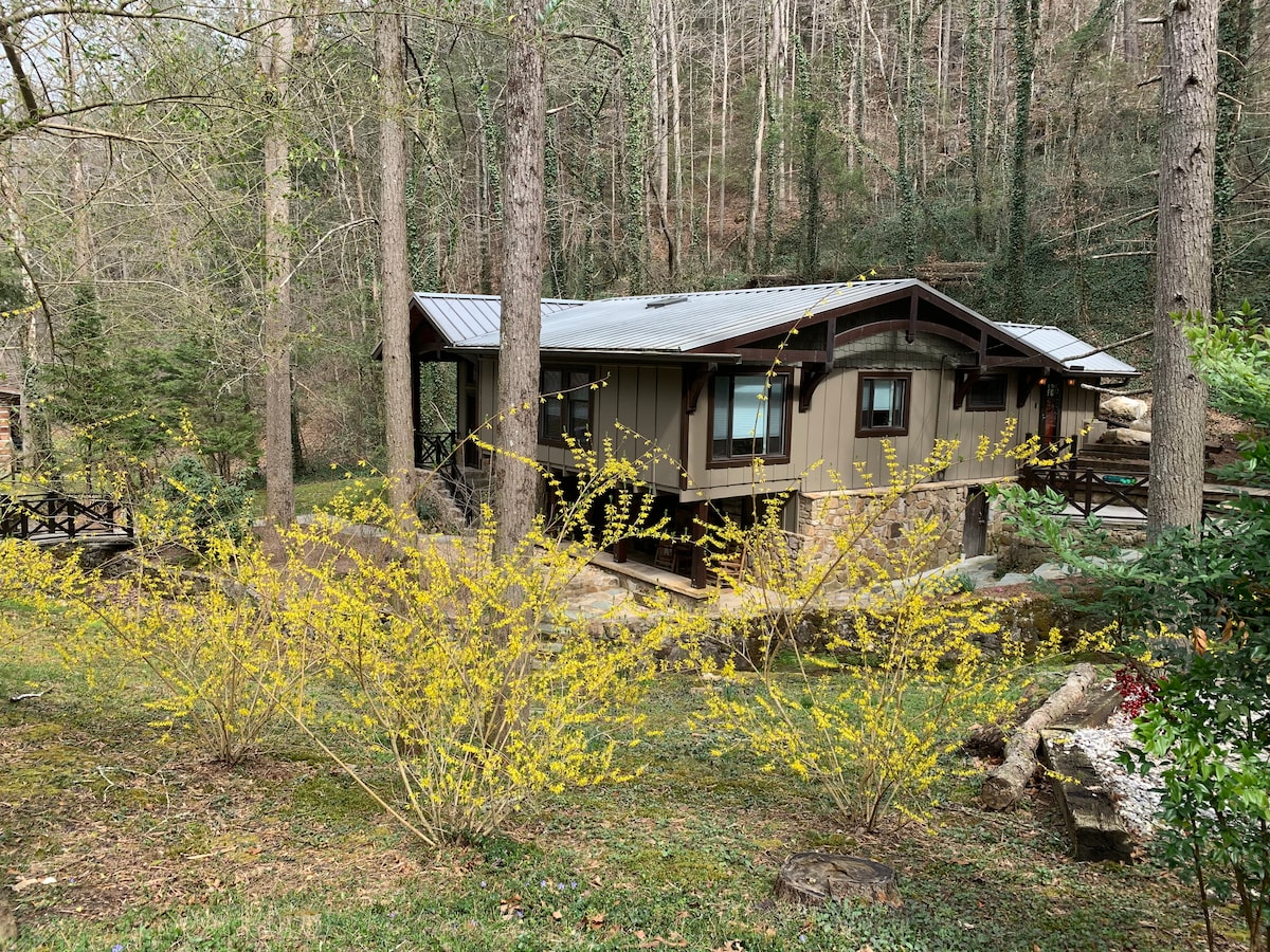 Relax with the family at this peaceful riverfront sanctuary. Located on the boundary of the Great Smoky Mountain National Park, Evergreen on Little River offers a rare blend of luxury and raw, natural beauty. Your arrival begins with a unique adventure: fording our small, stream at the horseshoe bend—the moment you’ll know you’ve truly escaped. As soon as you get settled, take our staircase down to a private, pristine stretch of the Little River. Relax, you are home!