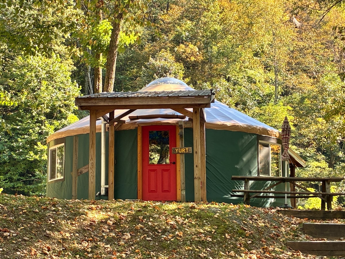 Reconnect with your roots off-grid in our locally handcrafted yurt just 3 mins from the Blue Ridge Parkway. Wake up on 60 secluded acres to the sun pouring through the canopy, and sip your coffee as the sun awakens the mountains. Take a morning walk on your own wooded trail to the waterfall before heading out to explore Crabtree or Linville Falls. Please note- (1) You will share a secluded outhouse with guests from our GeoDome. (2) This is an outdoor camping experience, READ all info below!
