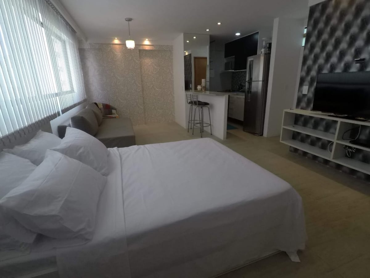 Stúdio aconchegante, com toda infra estrutura que você precisa. Muito bem localizado, próximo a mercados padarias, cafeterias, salão de beleza, taxi, parada ônibus, 2 quadras da praia de boa viagem(cerca de 550ms). O apartamento possui suíte com ar split, TV smart, 1 cama de casa Padrâol + 1 Sofá-cama, WIFI e cozinha com todos os utensílios. OBS Importante : Fogão cooktop de 2 bocas, NÃO TEM FORNO. TEMOS OUTRO ANÚNCIO - VEJA TBM: FLAT TOP NA MELHOR LOCALIZAÇÃO EM BOA VIAGEM.
