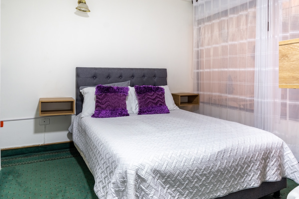 Our comfortable one bedroom apart-studio, interior location with windows towards a garage, and to a courtyard, bohemian, minimalist, with a small garden has a true city feeling! It comfortably accommodates four people and it´s centrally located on a street, with easy access to Simon Bolivar Metropolitan Park. Enjoy a complete kitchen, and access to Transmilenio. This space is ideal for two people; however, we provide a high quality sofa bed for two more people should the need arise. Hot water