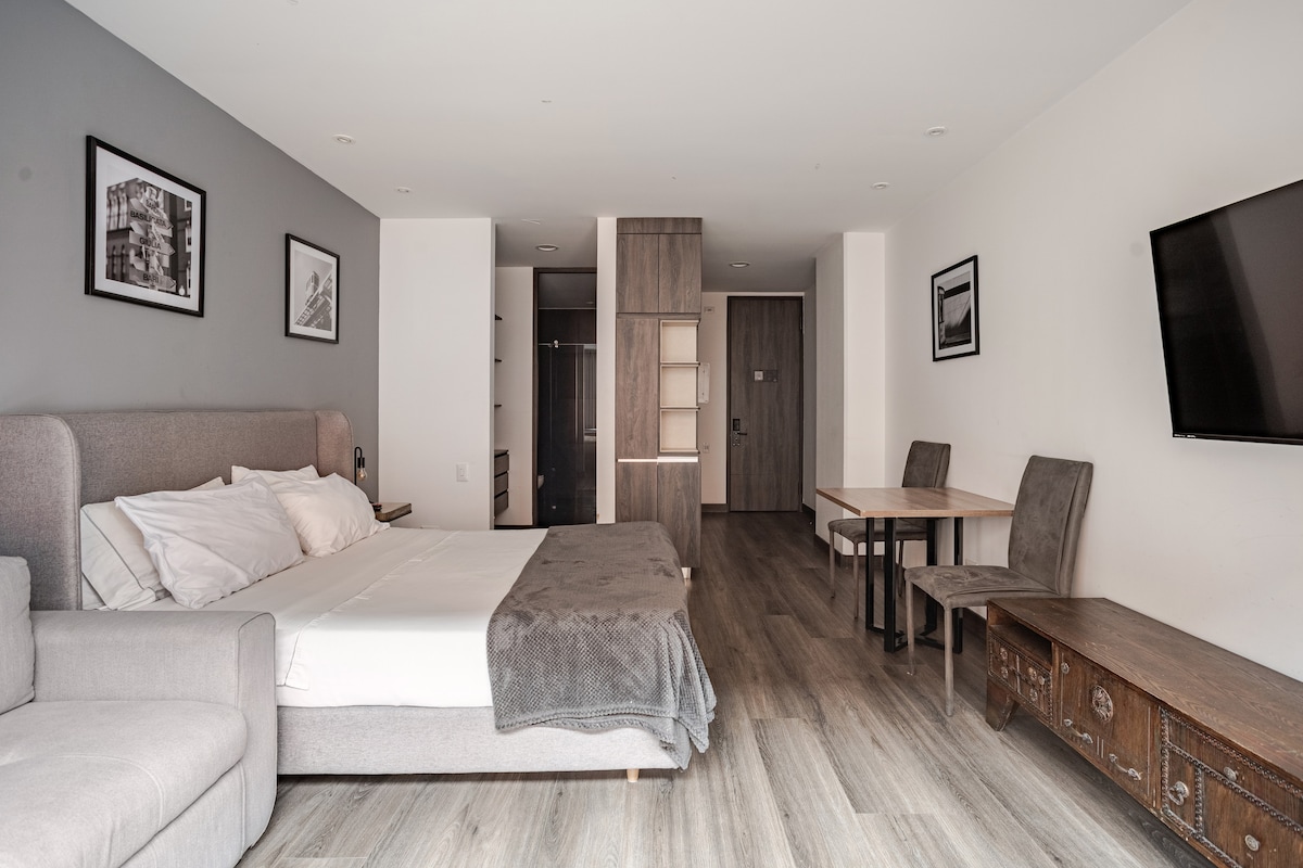 Luxury one bedroom in the most exclusive / safe area of Bogota (Chico) within walking distance from the best restaurants, shopping centers and close proximity to many businesses. Executive level accommodation with dedicated workspace, private terrace, automatic fireplace, reliable WiFi, private parking and building security. Ameneties: Enjoy the beautiful panoramic terrace with fireplace and outdoor grill. Also play squash and relax in the sauna or steam room.