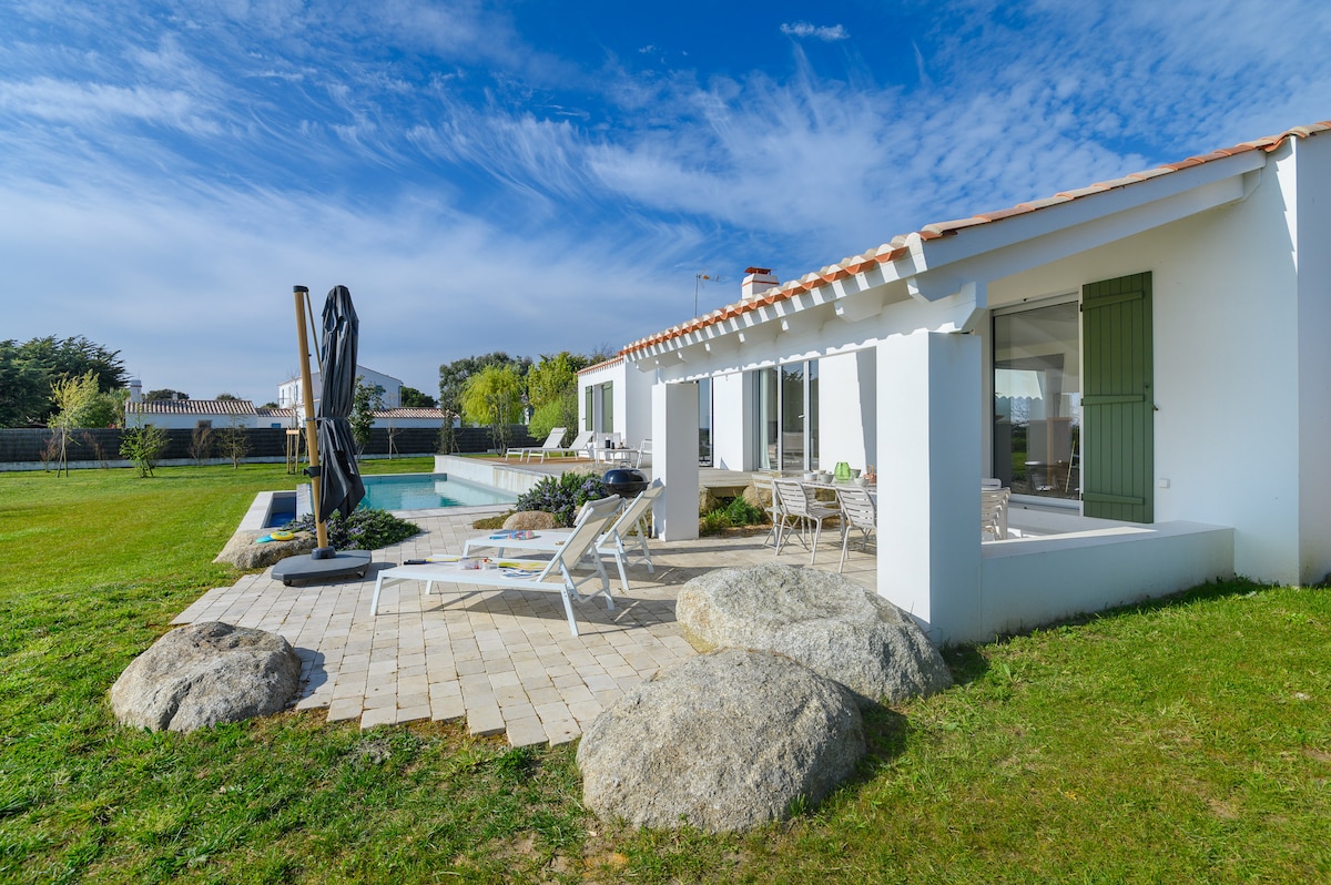 Située idéalement à 2 pas de la Chapelle du bois et à quelques minutes de la plage des Dames, la maison possède deux terrasses et un grand terrain à l'abri des regards en toute tranquillité. Elle est parfaite pour séjourner en famille ou avec des amis, les 6 chambres peuvent recevoir jusqu'à 11 personnes. Un grand jardin clos permet les jeux d'enfants en toute sécurité.