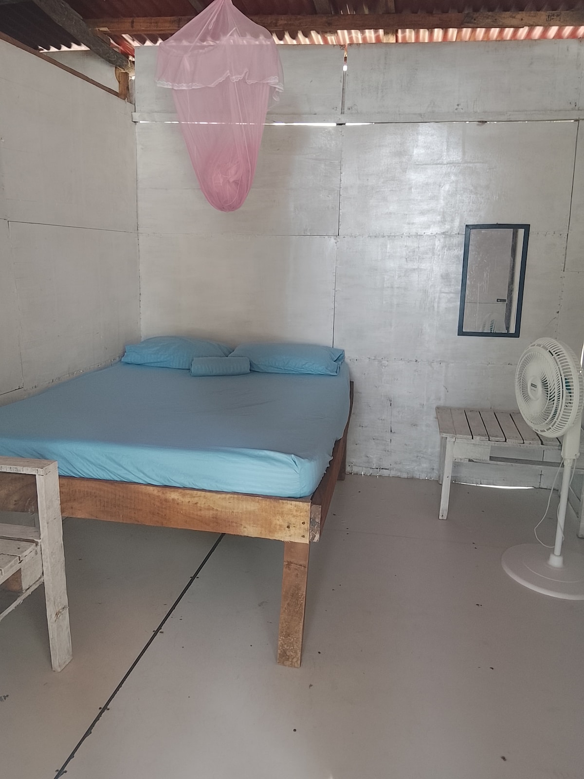 Es una cabaña en cemento con una cama doble 1.40 x 1.90 más una cama de niño con baño interno, muy sencillo rústico Abanico y algo para tener muy en cuenta En las islas del rosario no tenemos electricidad, se hace uso de plantas eléctricas la cual funciona de 6 pm a 8 am. Somos Pet Friendly, en la isla encuentras muchos animales, en kokomo tenemos perros guardianes, como lo tienen otras muchas islas, los cuales en las noches cuando todos nuestros huéspedes ya van a descansar se liberan.