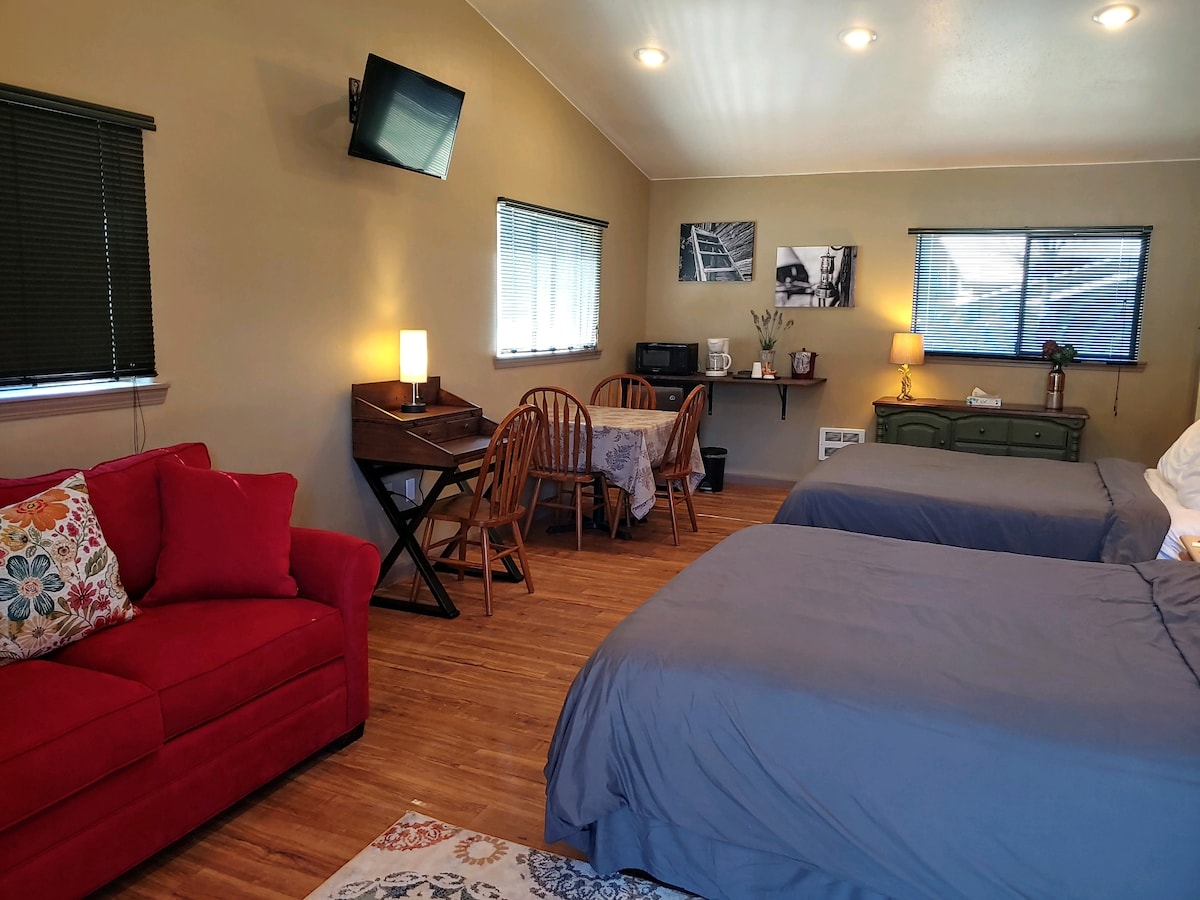 Stay in Sandpoint's Historic 'K2 Inn', this two bedroom unit features two queen beds, functional kitchenette, 1-bathroom, HDTV w/ cable, WIFI, parking. Walk to all Downtown Sandpoint has to offer, McDuff's Brewery just 1-block, Sandpoint's main entertainment strip just two blocks. No need to drive when your staying in the heart of downtown.