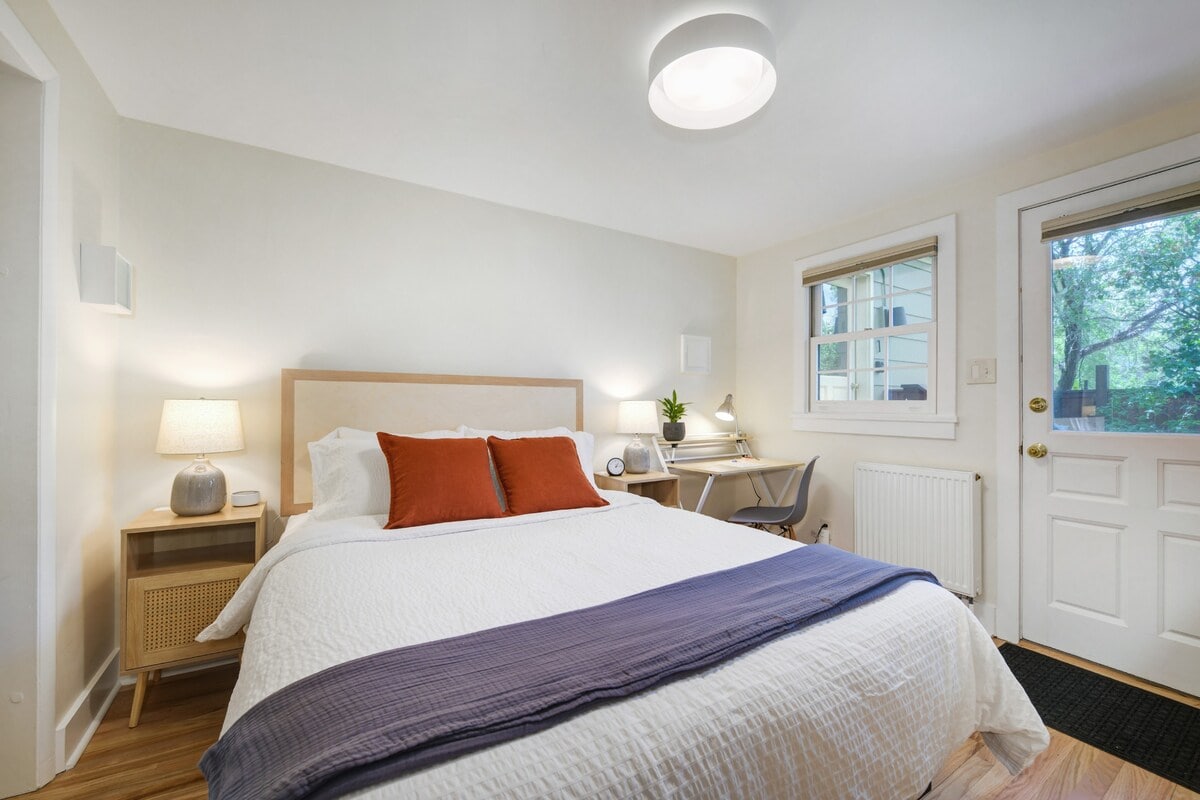 West Wing #2 is our most spacious room. It features a custom-designed locally made Queen bed, a desk, two skylights and windows overlooking the garden. The couch is perfect for snuggling up and watching a movie, or pull it out for a comfy additional Queen bed. This room sleeps 2-4 guests.