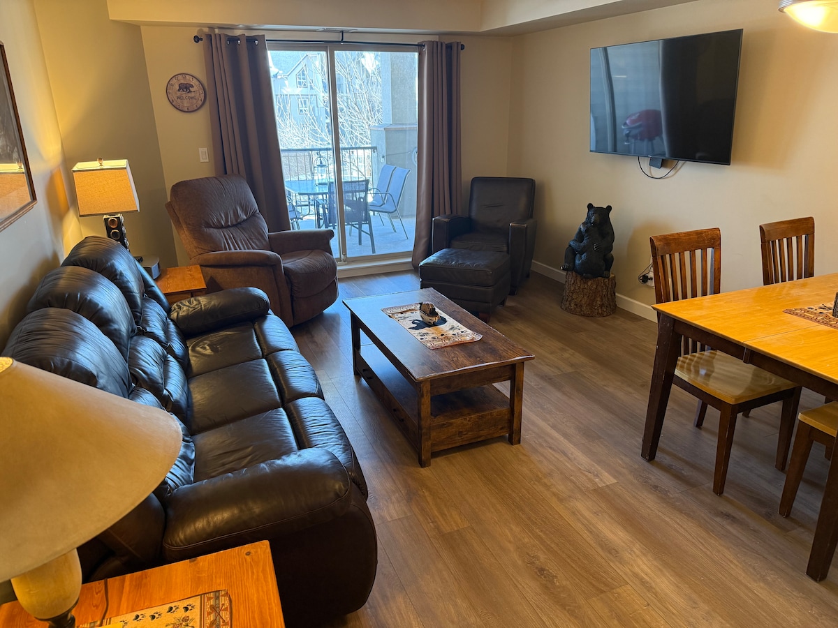 Make memories at this unique, family and pet friendly. The Bears Den is a comfortable 2 bedroom condo + den that sleeps 6. Pet friendly and has all the equipment needed for babies - pack & play and highchair. Fully equipped kitchen with many condiments and popcorn maker for movie nights. Custom log furniture with a one of a kind bunkbed. Sunny deck with table overlooks pool and lake. 4 Beach chairs and floaties. Close to 2 ski hills, 2 hot springs, lots of hiking trails and golf courses.
