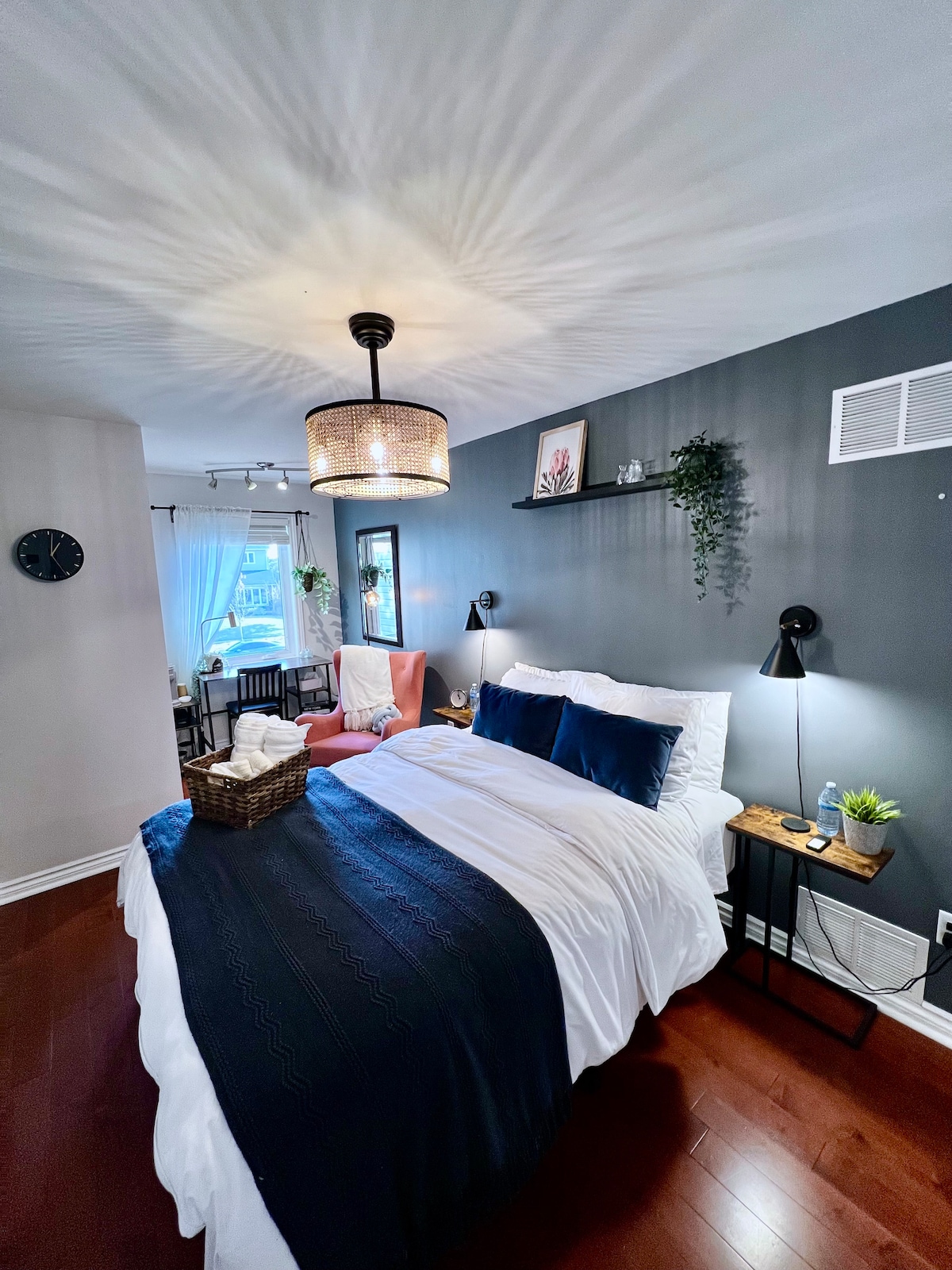 Enjoy a stylish 1-bedroom walkout basement apartment with a private entrance—perfect for a cozy, relaxing stay. Features include a full kitchen, modern bathroom with a luxurious rain shower, free Wi-Fi, and a bright living room with large windows and 2 TVs. Step outside to your private seating area, and enjoy free parking just steps from your door. With its updated design and thoughtful touches, this retreat blends comfort and convenience.