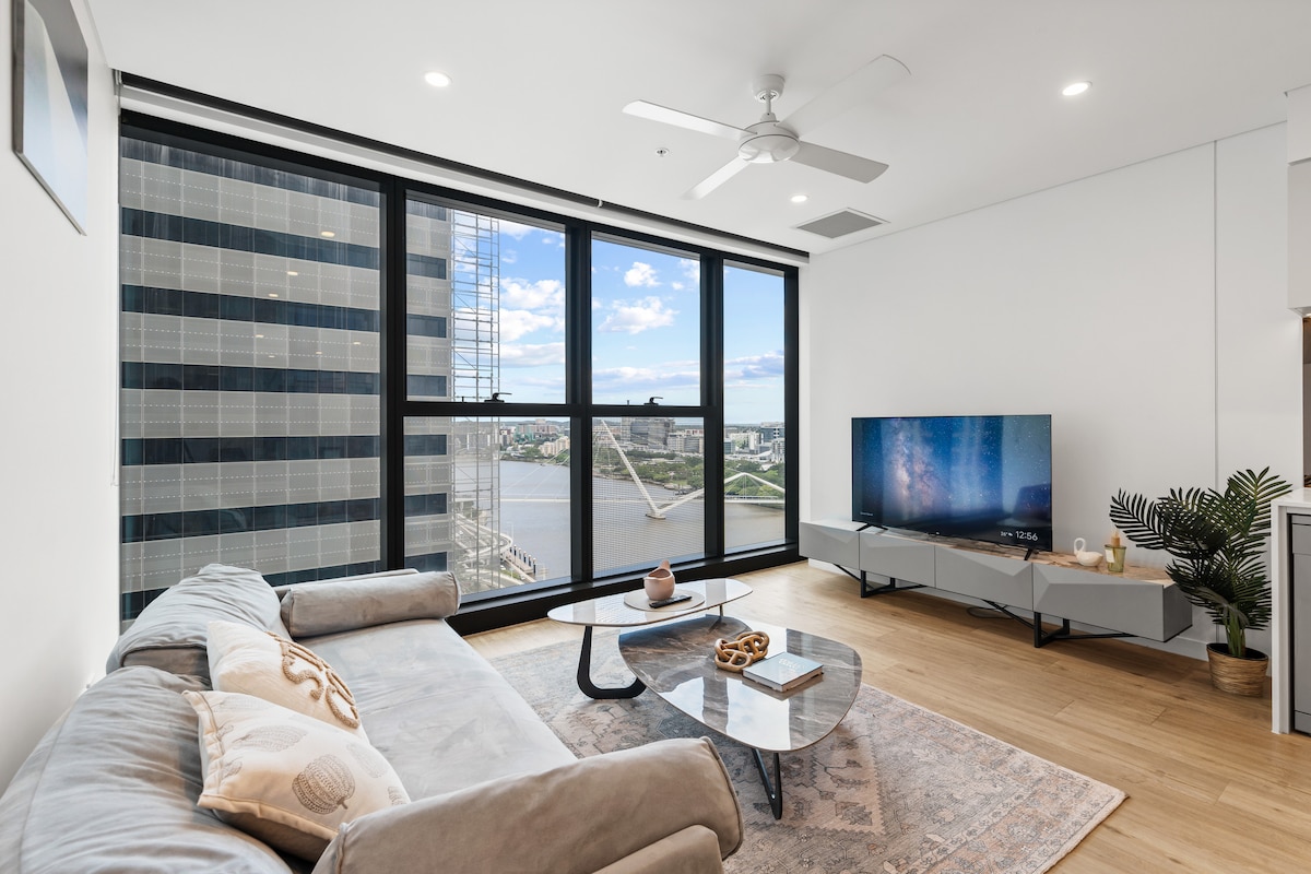 Soar above the city and unwind in serene, sky-high luxury at the New Queen’s Wharf. Perched on the 59th floor, this beautifully brand new curated apartment combines calming nature-inspired interiors with jaw-dropping, uninterrupted views of Brisbane’s skyline, river, and mountains. Step into a tranquil space where soft earthy tones, natural textures, and luxe finishes create the perfect retreat—whether you’re here for business, a romantic escape, or a peaceful getaway in the heart of the city.