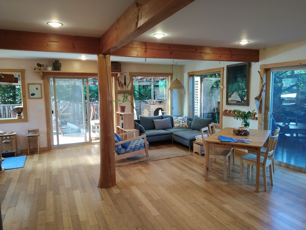 A cozy and bright, completely off-grid Cottage in the Woods with wood stove, large open main level, & loft with queen bed. Facilities include outhouse, outdoor shower with instant hot water, outdoor kitchen with camp stove, BBQ & cooler, bring ice. Sauna is available for use (bring bathrobe). Cottage is completely private & separate from main house. Breakfast included M-F. Weekend breakfast, vegetarian dinner, & massage are available upon request, before arrival, at extra cost.