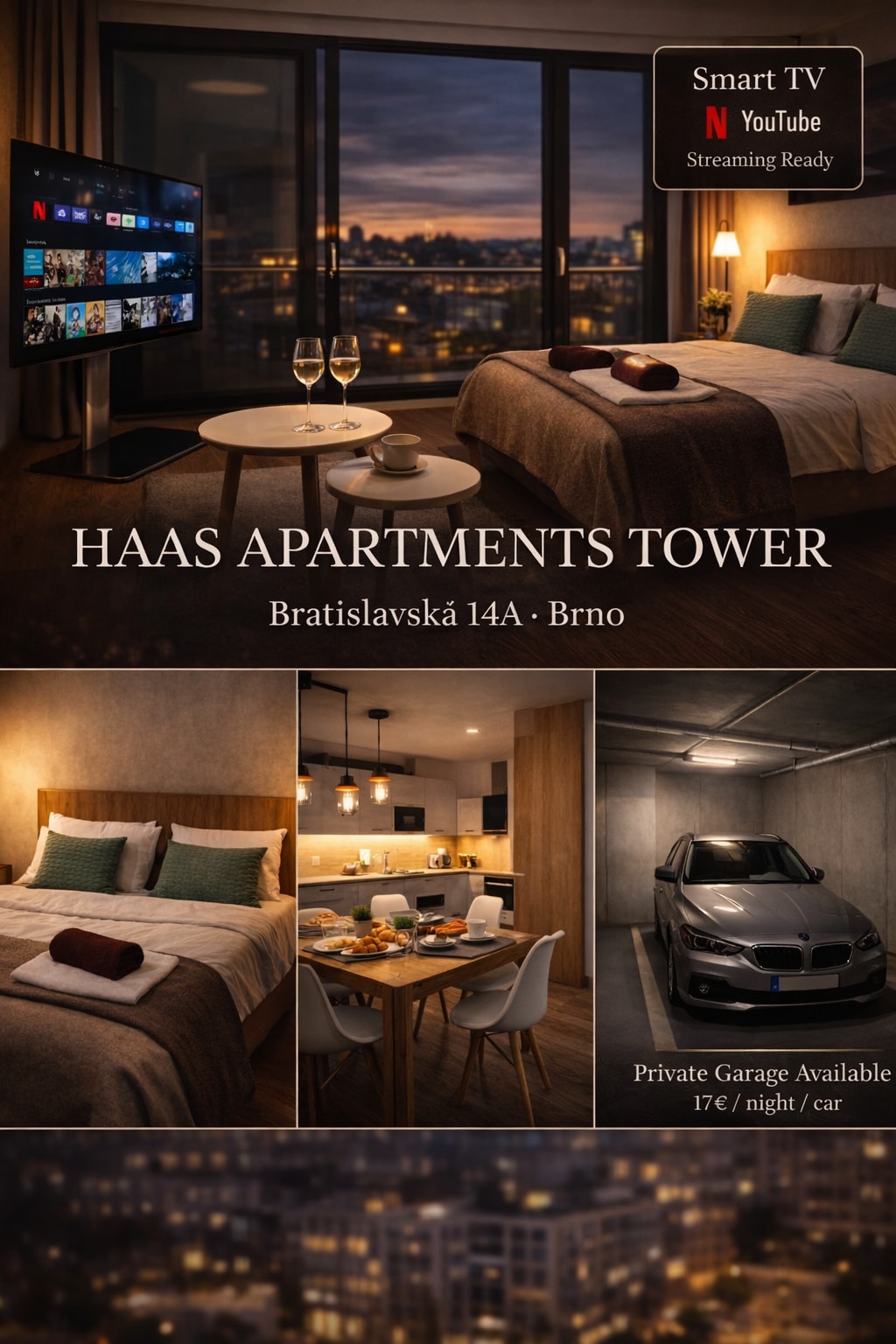 Vychutnej si stylový zážitek z ubytování v centru dění. Moderní, luxusně zařízený apartmán s terasou přímo v centru Brna, s nádherným výhledem na celé město a hrad Špilberk. Ambientní osvětlení vytváří krásnou a romantickou atmosféru. Apartmán je kompletně připravený pro váš pobyt. Plně vybavená kuchyň s myčkou, sklo-keramickou varnou deskou a troubou, varnou konvicí a kávovarem na výbornou kávu. V bytě bude tvůj komfort zajištěný rychlou wifi, moderní televizí a podlahovým vytápěním.