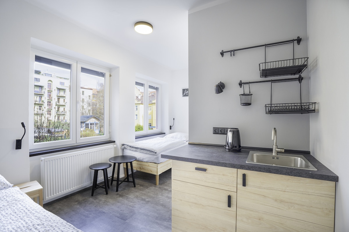 Nové studio Komfort III v centru Brna je malé, útulné, praktické, čisté zázemí pouhých 10 minut pěší chůze od hlavního vlakového i mezinárodního autobusového nádraží. Dobrá WiFi, prostorný balkon a jednoduchý styl. Díky své poloze je ideálním místem pro návštěvníky nejen historického centra moravské metropole. Chůzí 5 až 10 min. (Mahenovo i Janáčkovo divadlo, Dům umění, Náměstí Svobody, Zelný trh). PARKOVÁNÍ před domem v "zóně B" soukromé parkování ve dvoře za poplatek.