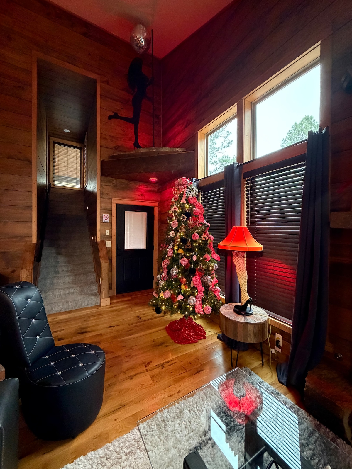 Welcome to Red Sunset, where all of your 50 Shades of Grey fantasies come true. This cabin is curated for consenting adults 25+ that are looking to explore their desires and indulge in activities that you only see in movies. This three story cabin features one king master bedroom with an ensuite bathroom and balcony. The kitchen and living room have a juke box, poker table, and wood burning fireplace. Downstairs, you will find a red room with a swing, cage, pole, and other spicy amenities! ;)