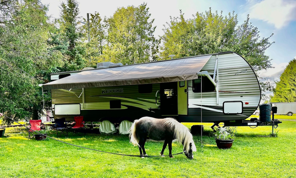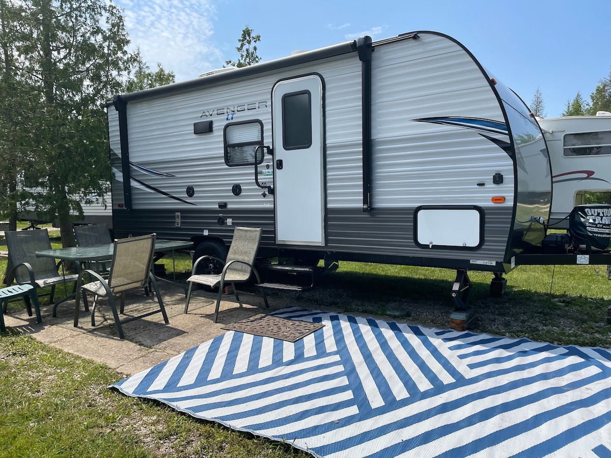 Beautiful new trailer that’s spacious! One queen bed, 2 doubles, sofa opens! bbq with sitting area! Fully stocked kitchen and bath, no need to bring towels or bedding…safe for your valuables … 16’ power awning ! Saugeen river is 1 min to go for a swim, to fish, canoe or just tubing down river! Port Elgin and Southampton 15-20 min away. Lots of places to eat if you don’t feel like cooking! There’s a fire pit to sit around and if you’re in need of a vacay to unwind, please be our guests!