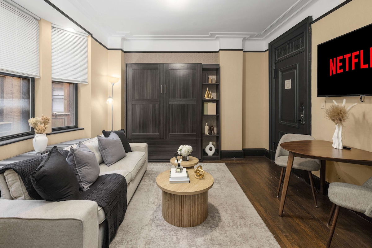 Step into NYC history at this iconic short-term stay in the legendary Mansfield building—once a grand hotel said to have hosted Gatsby himself. Located on West 44th St between 5th & 6th Ave, you're steps from Bryant Park, Times Square & Grand Central. This charming unit features 1 cozy bedroom with a queen bed, WiFi, coin laundry, fitness room & hair dryer. Enjoy a serene, stylish stay in the heart of Midtown. We're happy to assist with anything you need!