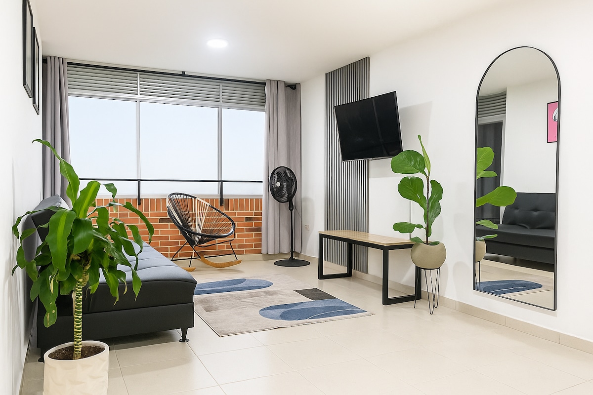 Beautiful brand new apartment. 10th floor with amazing sunset view. Central location. Residential and safe area next to the Cacique Mall and Neomundo Convention Center, easy access to Carrera 33,Cabecera,Girón and Floridablanca. 2 bedrooms, 2 balconies, hammock, 2 bathrooms, 2 beds, an auxiliary bed and a sofa bed. Excellent lighting and ventilation, 300mbps WIFI, 2 TVs with access to DirecTvGO, Netflix, Amazon and HBO. Ground floor of the complex with minimarket, bakery, pharmacy, among others.