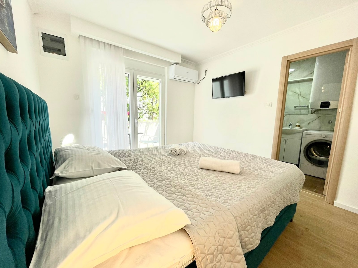 Cosy Villa in the center. There is one king size bed in this room and we can put extra bed for 1 person upon request so the capacity can be 3 person. The room has ✔AC/Heat ✔private bathroom ✔LCD TV ✔terrace ✔hair dryer ✔fridge ✔safebox ✔shampo&showergel ✔slippers ✔kitchenette. Kitchen utensils will be provided by us. 3 minutes walking distance to 4 different supermarkets. 200 mt to famous Slovenska Beach, 350 mt to TQ Plaza and many restaurants. 1 km to Stari Grad. 500 meters to bus station.