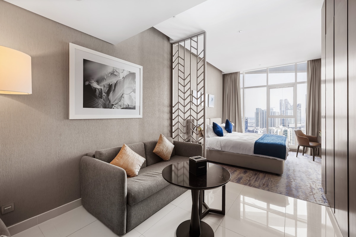 Luxury studio apartment with fantastic canal view (26th floor) the heart of Downtown and close to Burj Khalifa and Dubai Mall. The apartment is composed by: one bedroom and living room in a unique space with sofa bed, bathroom (with bath tube) and great canal view. It’s perfect for family, couples or friends. Within the building there are pool with restaurant and bar, gym, spa. Self check-in available, reception h24 and free parking. The building is a 5 start hotel apartment called DAMAC Prive!