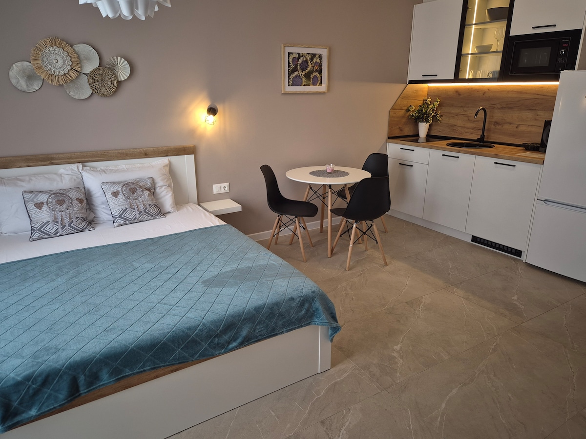 Добре дошли в едно стилно и уютно студио, създадено с внимание към всеки детайл – за Вашето пълноценно преживяване и домашен комфорт. Разположено в комуникативна част на града, това компактно, но функционално жилище съчетава модерен интериор с топла атмосфера. Подходящо е както за пътуващи по работа, така и за двойки или семейства.
