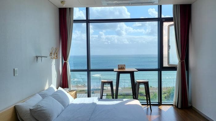 You can enjoy a breathtaking and dynamic ocean view of Busan through the wide window in the living room and do a jacuzzi with a fire pit on the rooftop. The Busan Port Bridge is one of Busan's famous landmarks, which shines with colorful lights at night. In the living room and rooftop, you can enjoy the bridge with a dynamic port view.