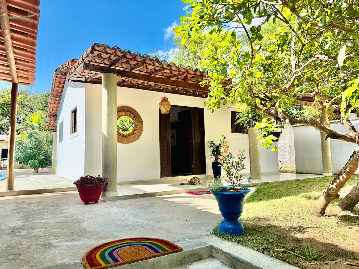 São lindas casinhas independentes, com amplo jardim em meio às arvores. Conta com 1 cama de casal, (roupas de cama e toalhas de banho trocadas a cada semana), Ar Condicionado e ventilador de teto, TV , WiFi, mesa para trabalhar, cozinha americana equipada com utensílios básicos, fogão e geladeira, banheiro com chuveiro elétrico, rede, área de serviço, chuveiro externo e estacionamento externo para carro. Estou disposto a qualquer ajuda ou informação.