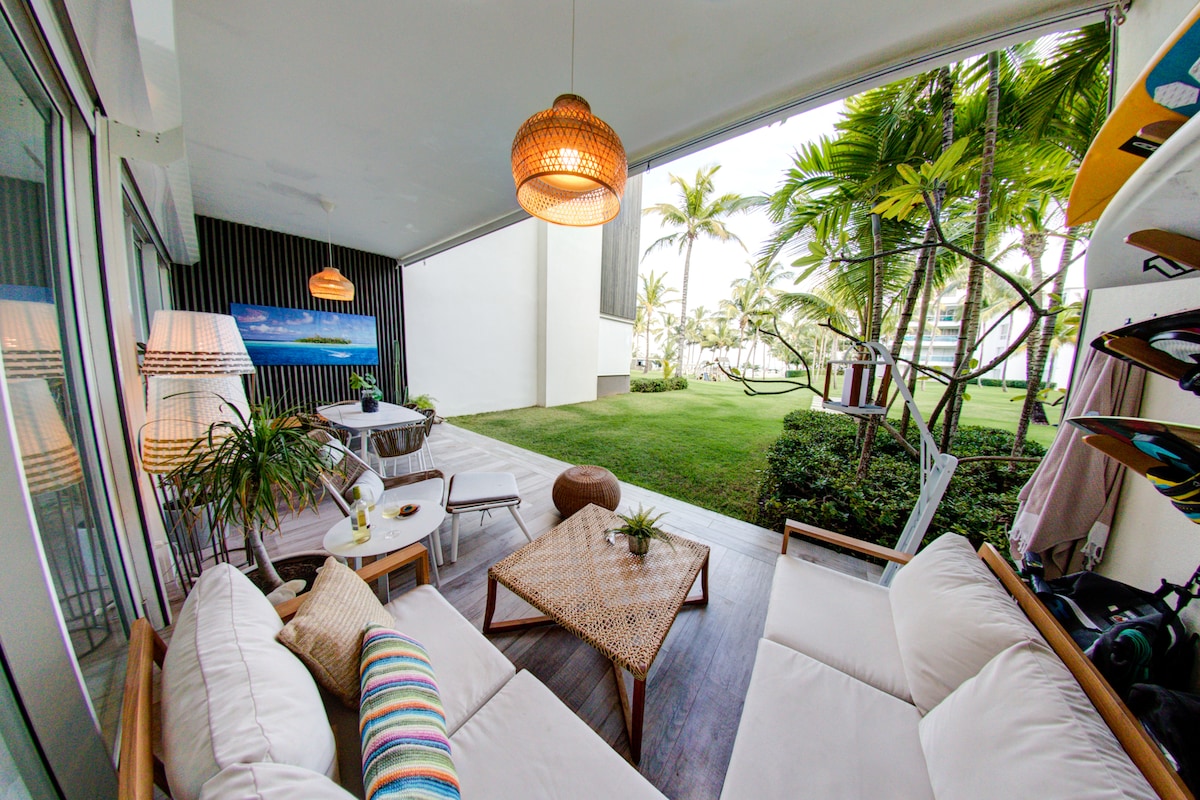 Beautiful luxury, gut-renovated, 2BR beachfront condo with a huge balcony for dining, overlooking the garden, pool and Kite Beach! Marble bathrooms, wine cooler, full kitchen, brand new appliances. Exact location: Cabareef. Take a long, relaxed breath and sink into the best location in Cabarete. Quiet, safe, and centrally located, but a 2-minute walk from great bars and restaurants. My great-condition 2019 Mazda SUV available as an extra for less than typical prices.