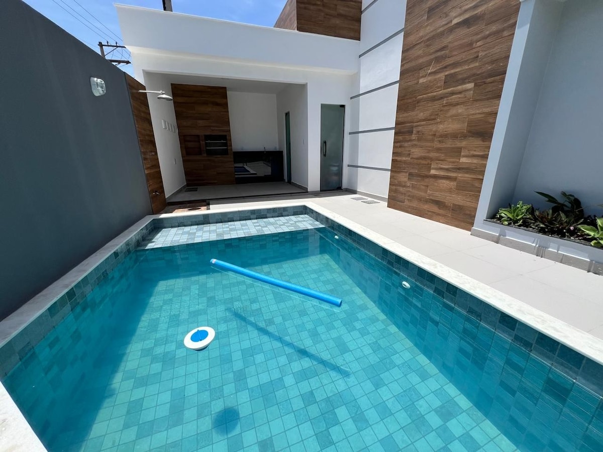 A casa fica no condomínio verão vermelho, Unamar, Cabo Frio. Temos uma ótima área gourmet com uma piscina lindíssima. A casa eh toda cercada, permitindo tranquilidade para quem tem pet ou crianças. Temos um lago ornamental lindo, com uns peixes, deixamos ração para as crianças poder tratar eles e isso acaba sendo uma diversão! A casa tem 3 quartos(sendo 2 suítes), todos com ar condicionado😀