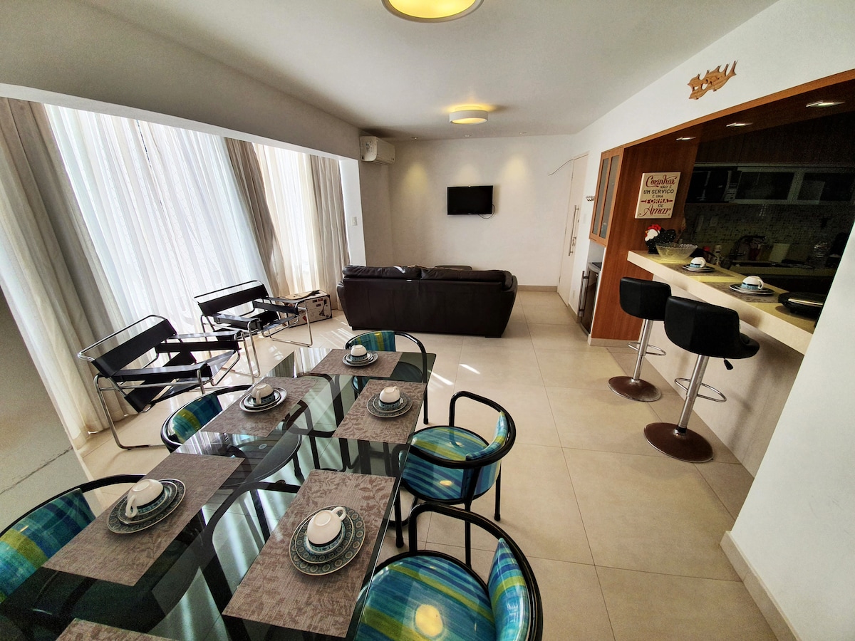 Belo,Novíssimo e Amplo apartamento Avarandado, com 2 quartos :1 Suíte c/TV cama de casal, cama de solteiro e 1 colchão solteiro, 1 Quarto cama Queen ambos com ar condicionado. Banheiros com água quente, secador de cabelo.Sala 2 ambientes, mesa de jantar p/8 pessoas, TV 55"a Cabo, SKY, NETFLIX, INTERNET ALTA VELOCIDADE, sofá Cama de Casal, AMPLA COZINHA completa, Coller. Área de Serviço c/Filtro c/ água gelada e ambiente, Máq. Lavar, FERRO. 2 vagas garagem. Roupa de cama,mesa e banho. Elevador.