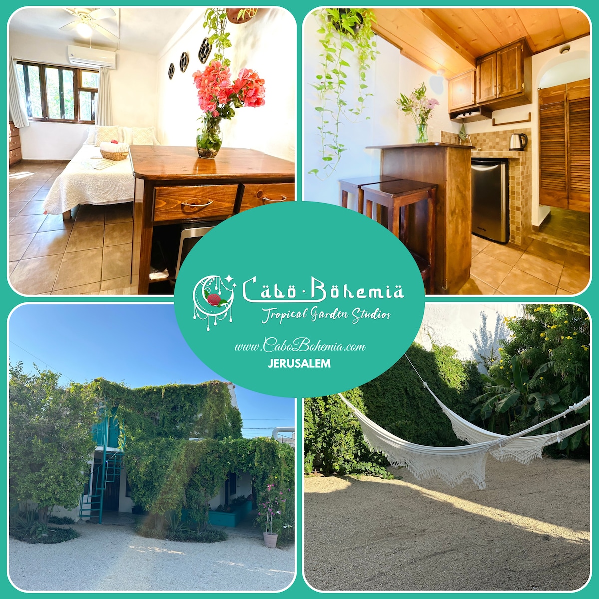 Spacious and super clean unique APARTMENT (220 sq ft) in a unique tropical garden oasis in the heart of downtown (don’t get exiled to the middle of a barrio!) 5 minute walk to marina and 15 to the beach. FREE parking, private bathroom, large closet, memory foam mattress, iron, blackout curtains and room safe. Fully equipped private kitchen. Coffee maker, electric kettle and coffee & tea provided. Shampoo, soap, body lotion and antibacterial *Tv only has Netflix and YouTube TV size: 72 cm X 42 cm