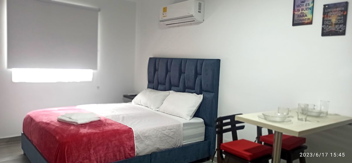 Encantador aparta-estudio ubicado en el corazón de cali. Cuenta con: CAMA QUEEN, colchón semi ortopedico, AIRE ACONDICIONADO, smart TV, ZONA DE TRABAJO, INTERNET DE ALTA VELOCIDAD, clóset. Baño completo, DUCHA CON AGUA CALIENTE. COCINA completa y dotada. SOFACAMA Cercano a las Canchas Panamericanas, Estadio Pascual Guerrero, centros comerciales como Palmetto Plaza, Mallplaza, Cosmocentro y a las principales clínicas de la ciudad como Imbanaco y Farallones.
