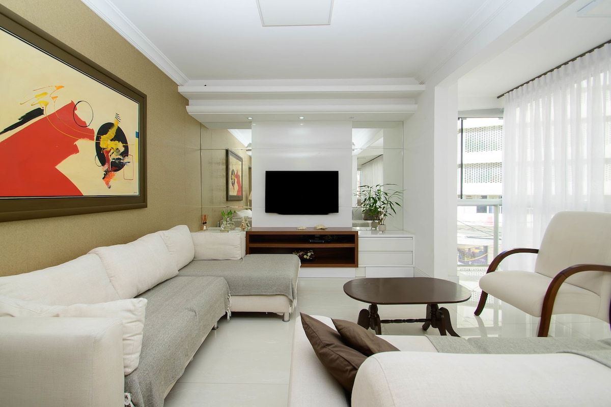 Incredible apartment in Balneário Camboriú, with beautiful views of the entire beachfront. Space with a suite and two bedrooms with private bathroom, large living room, equipped kitchen and balcony facing the sea. Living room and bedrooms recently renovated and air conditioned, high quality mattresses, new furniture and fixtures. Three private and covered parking spaces. We provide bed linen for all beds and one bath towel per guest.