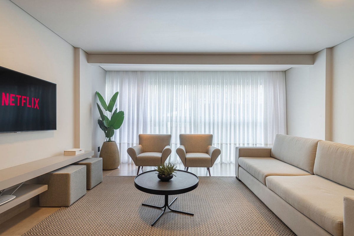 Esse apartamento além de encantador é super confortável, possui: - Porta com fechadura digital - ar condicionado em todos ambientes - Wi-Fi de 350 mega - Jacuzzi para 2 pessoas com hidro - Churrasqueira à carvão - Cozinha completa - TV smart na sala e quarto, 43'' - Camas Castor, com pillow e molas ensacadas - Roupas de cama e banho - Duchas à gás - Lavanderia com máquinas de lavar/secar - Secador de cabelos - Ferro e tábua de passar - Uma vaga de garagem gratuita