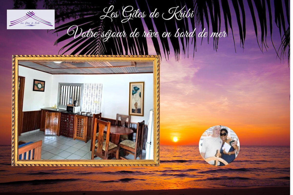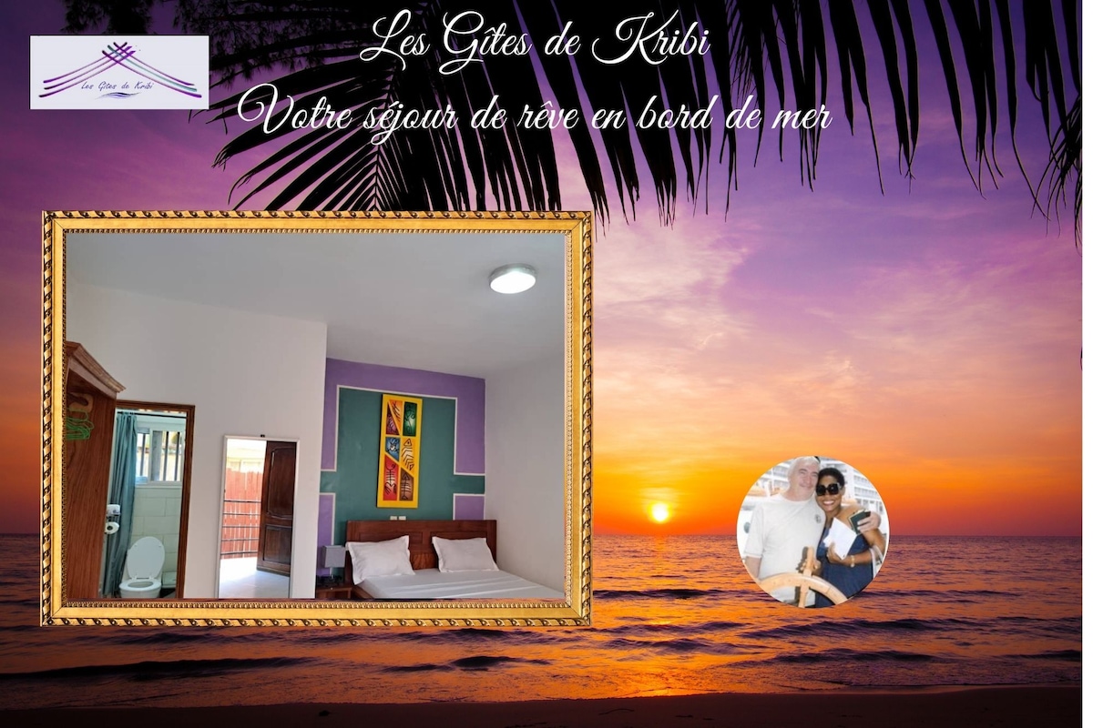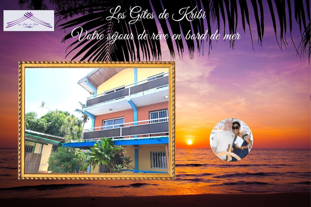 Se sentir chez soi ailleurs. Appartement meublé d'1 chambre pour 2 personnes (possibilité de mise à disposition d'un matelas d'appoint pour 2 personnes supplémentaires moyennant supplément), idéal pour week-end en couple, au sein d'une résidence privée de 1500 m2 composée de 4 appartements en bord de mer à Kribi, Cameroun. Possibilité de réserver l'ensemble de la résidence (selon disponibilités), pour cela contactez-nous. Capacité totale d'hébergement de la résidence est de 12 personnes.