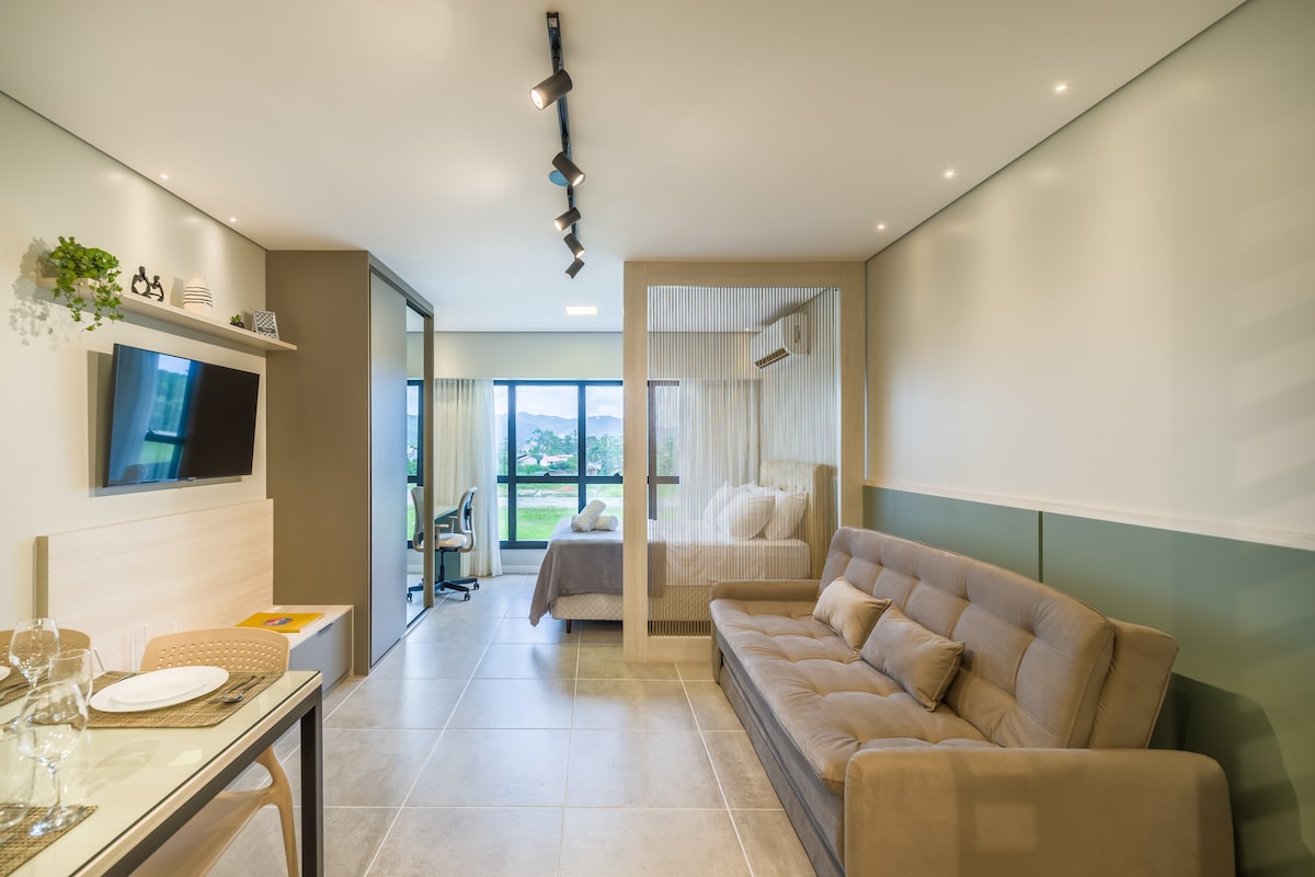 Studio.b2b – Conforto, Estilo e Localização Perfeita na Ilha da magia em Florianópolis Hospede-se em um estúdio moderno e completo, ideal para até 6 hóspedes ou 3 casais. O condomínio conta com: - Centro multifuncional (Food Hall) - Angeloni (Supermercado e lojas - térreo) - Centro gastronômico - 1° andar (C1) - Localizado em frente ao Hospital Universitário, UFSC e a poucos metros do Shopping Villa Romana. - O Studio é ideal para casais, estudantes, profissionais, "nômades digitais".