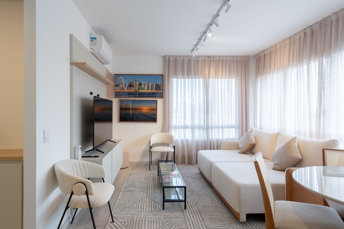 Studio recém reformado e decorado no Centro Cívico com: ar condicionado em todo o ambiente, cozinha completa, smart tv e churrasqueira privativa O prédio oferece piscina aquecida, academia, terraço panorâmico, sauna, brinquedoteca, jacuzzi e lavanderia (paga) Ideal para até 2 pessoas, fornecemos roupas de cama de tolhas de 1ª linha Localização excelente, perto de shoppings, mercados, restaurantes e padarias com fácil acesso para explorar a cidade Estacionamento pago no local disponível