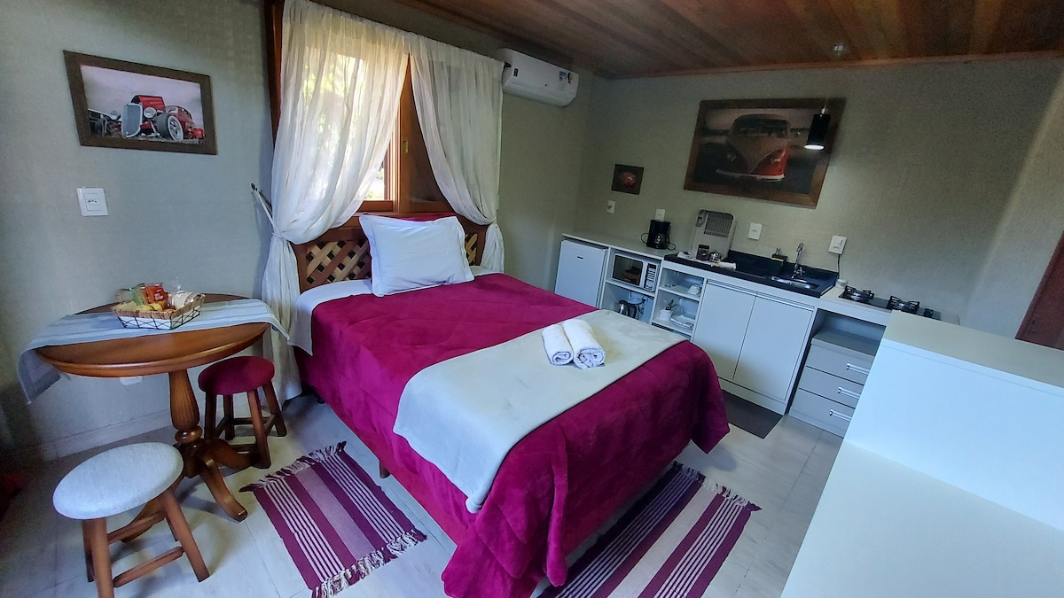 O local fica situado a 1.100m do centro de Gramado em um bairro familiar e bem tranquilo. Conta com banheiro privativo, secador de cabelo, ferro de passar, TV com canais locais, mini cozinha com geladeira, microondas, cafeteira, chaleira elétrica, sanduicheira e todos os utensílios; NÃO TEM FOGÃO. Local livre de mofo e extremamente limpo.
