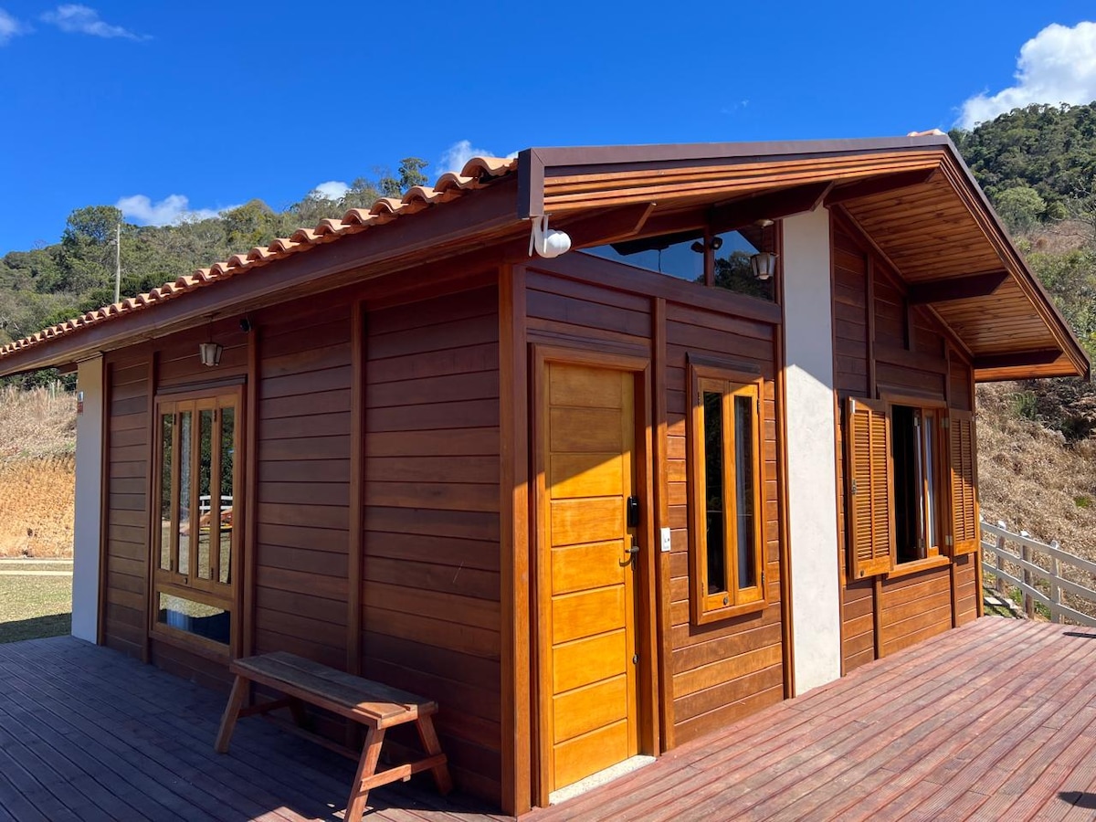 Do lado de fora, natureza exuberante, trilha, cachoeira, piscina de água de nascente, churrasqueira, fogueira. Dentro, lareira, cama king com cobertores maravilhosos, Wi-Fi potente, Smart TV 40" e cozinha equipada. A área externa e Jacuzzi compartilhada com outros 3 chalés. Reservar horário. É possível interagir com os animais (cachorros, gatos, galinhas, patos). Pode-se encomendar com antecedência café da manhã. Oferecemos terapias (massagens, tarô, Soundhealing)