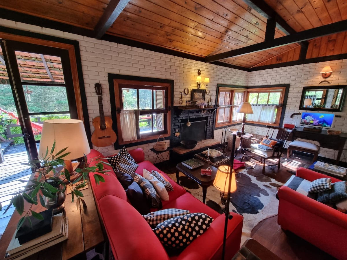 Esta charmosa cabana dos anos 50 está localizada em um amplo terreno muito arborizado o que a torna especial e com bastante privacidade. Sendo toda em madeira, possui um perfume característico. Isso a deixa mais aconchegante e diferente à pessoas não acostumadas ao uso da lenha queimada dentro de casa ! Característica marcante numa cabana no meio da mata que remonta tempos em que só se usava lenha, para cozinhar e aquecer a casa e é uma das coisas de que mais gosto nesse Refúgio na Natureza !