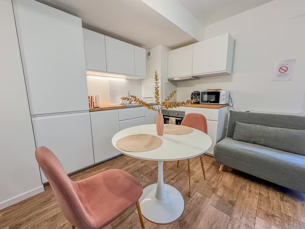 Elegant and central accommodation completely renovated and newly equipped. Direct connections with the airport and Paris center. Near the Villepinte exhibition center. 25m² overlooking the shopping street bakery, supermarkets and restaurants (open late at night), cinema theater Fully equipped kitchen + coffee and tea washing machine available Hydromassage shower, sink, towel dryer, wall-hung toilet, large illuminated mirror and Bluetooth®. Ironing board and iron. Towels and bed linen provided.